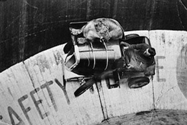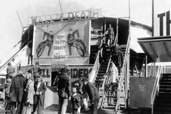 After too many fatalities, the sport was banned. But the racers needed a new challenge, by eliminating the straights and making the wooden track 90 degrees perpendicular to the ground they started to entertain the public and a new attraction was born, ' The Wall of Death'.
